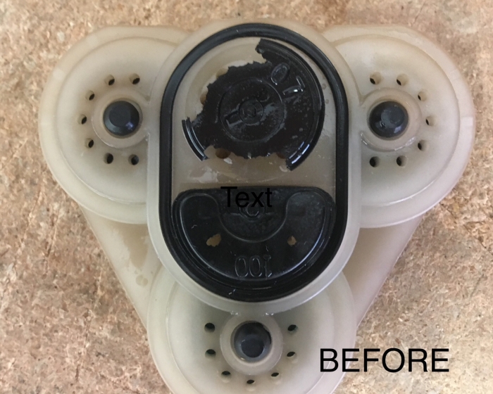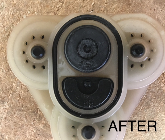 Replacement for the valve plate on the Aquatec pump (not a pro 300 psi pump). If any of the circles or half circles have a hole or tear, the pump will not be able to build pressure and this plate needs to be replaced. To access this plate, remove the pump from the cube. Then use a torx 20 bit to remove the pumphead.
