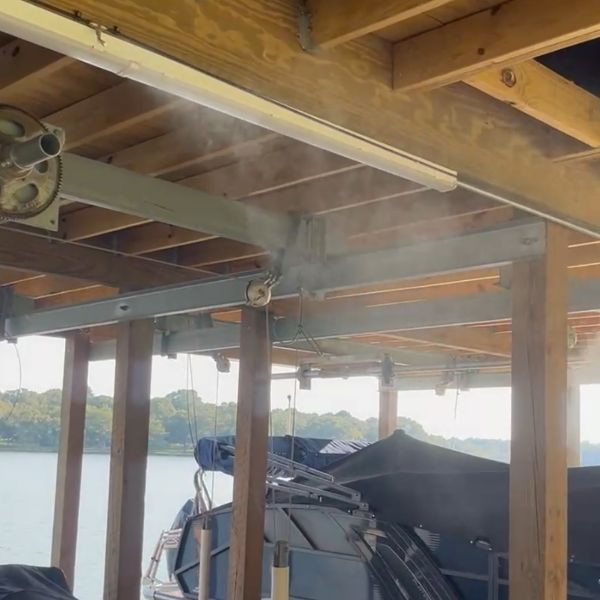 Nozzles are typically spaced about 10 feet apart along eaves, fences, and other structures to create a perimeter barrier around your protected area. Installation is straightforward and can usually be completed in an afternoon.