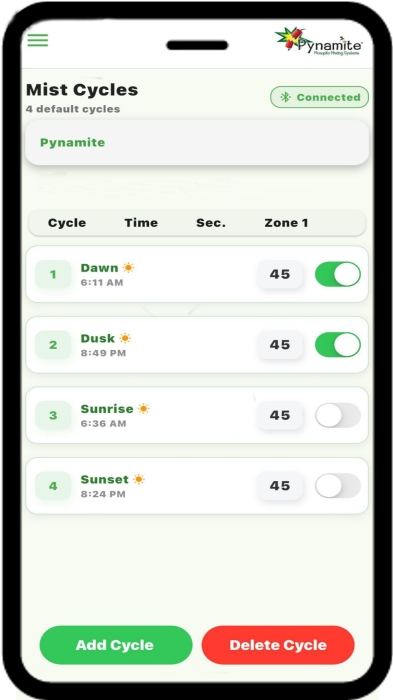 The Cube Pro is managed through the free Pynamite App, available for Apple and Android devices. Program misting days, times, and duration with ease. Preset dawn and dusk cycles are included, the most effective times to mist and the system automatically adjusts for daylight saving time.
